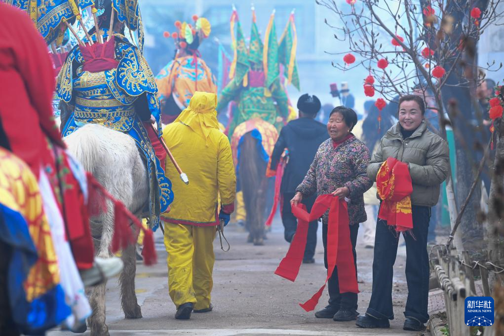 3月2日,陇县黄花峪村村民在家门口迎接社火队。
