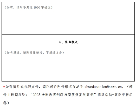 1.填写“2025全国教育创新与高质量发展案例征集活动申报表”,并发送至邮箱:xhweducation@news.cn(邮件主题请注明:2025全国教育创新与高质量发展案例征集活动+案例申报名称),有关图片、媒体报道复印件等可作为附件同时发送。