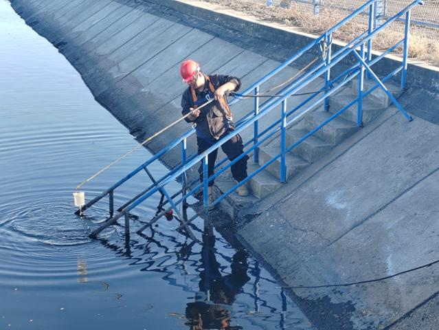 图为作业人员取水样
