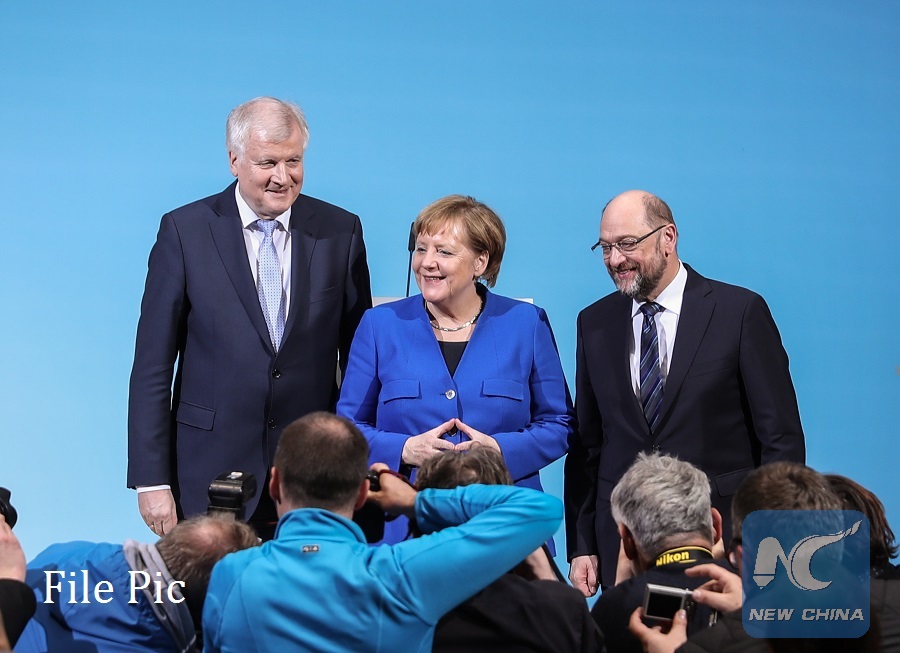 German Chancellor and leader of German Christian Democratic Union (CDU) Angela Merkel (C), leader of German Christian Social Union (CSU) Horst Seehofer (L) and leader of German Social Democratic Party (SPD) Martin Schulz pose for photos after a joint press conference at the headquarters of SPD, in Berlin, Germany, on Jan. 12, 2018.(Xinhua/Shan Yuqi)