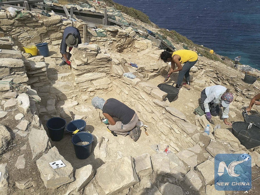 Photo taken on Sept. 29, 2017 shows archaeologists working on Keros Island in Greece. Archaeologists unearthed new findings on the Aegean Sea island of Keros during excavations in 2017, Greece's Culture Ministry announced on Jan. 24, 2018. The findings reveal that locals in the early Bronze Age had far more sophisticated architectural and technical expertise than initially thought. (Xinhua/Greek Ministry of Culture)