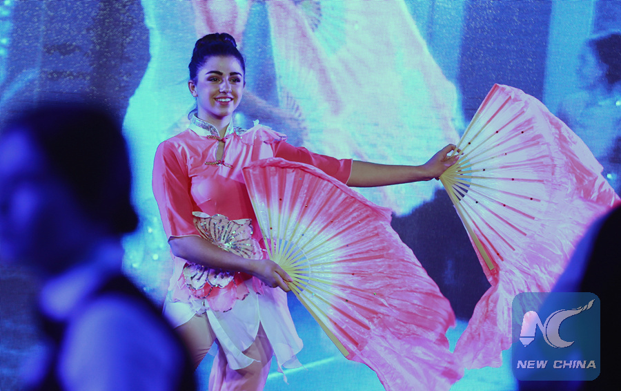 A Ukrainian woman performs Chinese traditional dance at a ceremonial reception in Kiev, Jan. 23, 2018. (Xinhua/Chen Junfeng)