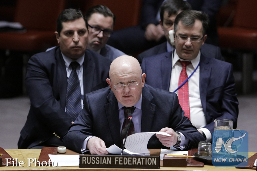 Russian Ambassador to the United Nations Vassily Nebenzia (Front) addresses a Security Council emergency meeting regarding accusations of the use of a nerve agent in the United Kingdom at the United Nations headquarters in New York, on March 14, 2018. (Xinhua/Li Muzi)