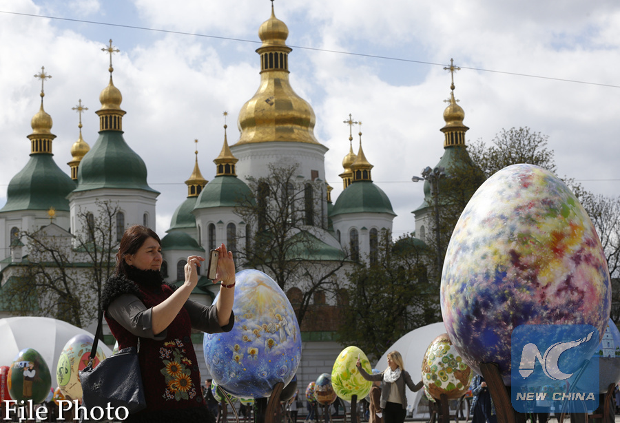 A woman takes pictures of Easter eggs on display in front of St. Sofia Cathedral in Kiev, Ukraine, Wednesday, April 12, 2017. (AP Photo)