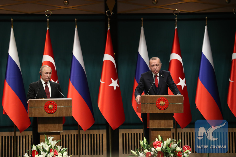 Turkish President Recep Tayyip Erdogan (R) and Russian President Vladimir Putin attend a joint press conference following their meeting in Ankara, Turkey, April 3, 2018. (Xinhua/Mustafa Kaya)