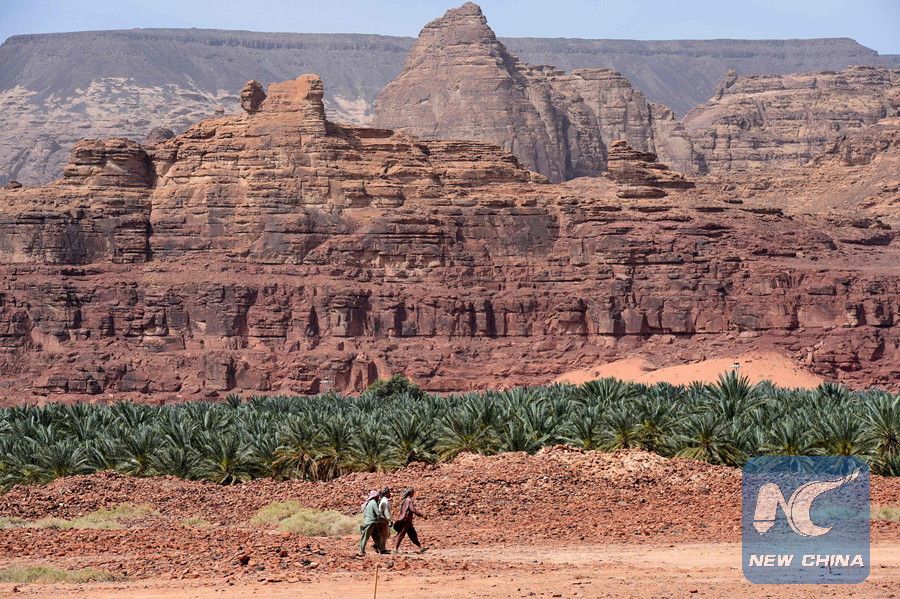 A picture taken on March 31, 2018 shows foreigners walking next to a date farm amidst sandstones in the Khuraiba archaeological site near Saudi Arabia's northwestern town of al-Ula. (AFP photo)