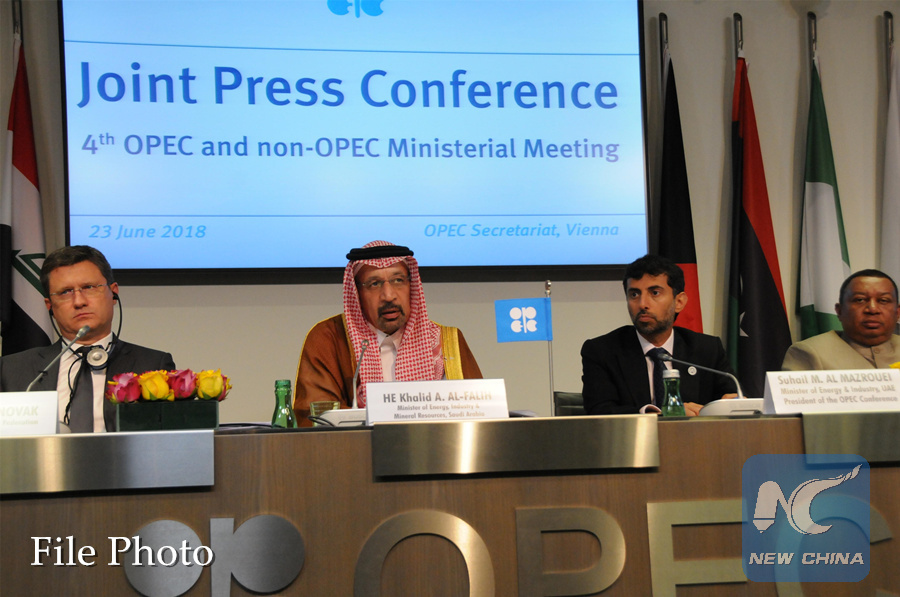 Russian Energy Minister Alexander Novak, Saudi Arabia's Oil Minister Khalid al-Falih, OPEC President and the United Arab Emirates Energy Minister of Suhail Al-Mazrouei and OPEC Secretary-General Mohammed Barkindo (L-R) on Saturday attend a press conference after a OPEC and non-OPEC oil producers meeting in Vienna, Austria, June 23, 2018. (Xinhua/Liu Xiang)