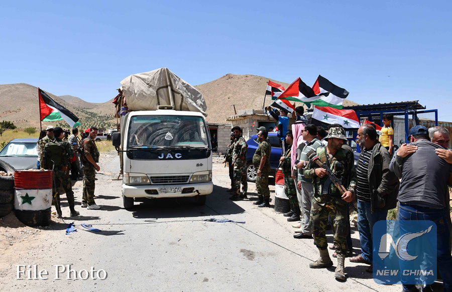 Vehicles transporting Syrian refugees move back in Syria through the Zamrani crossing between the Lebanese town of Arsal and the Syrian town of Jarajir in the western al-Qalamoun region, north of Damascus, capital of Syria, on June 28, 2018. (Xinhua/Ammar Safarjalani)
