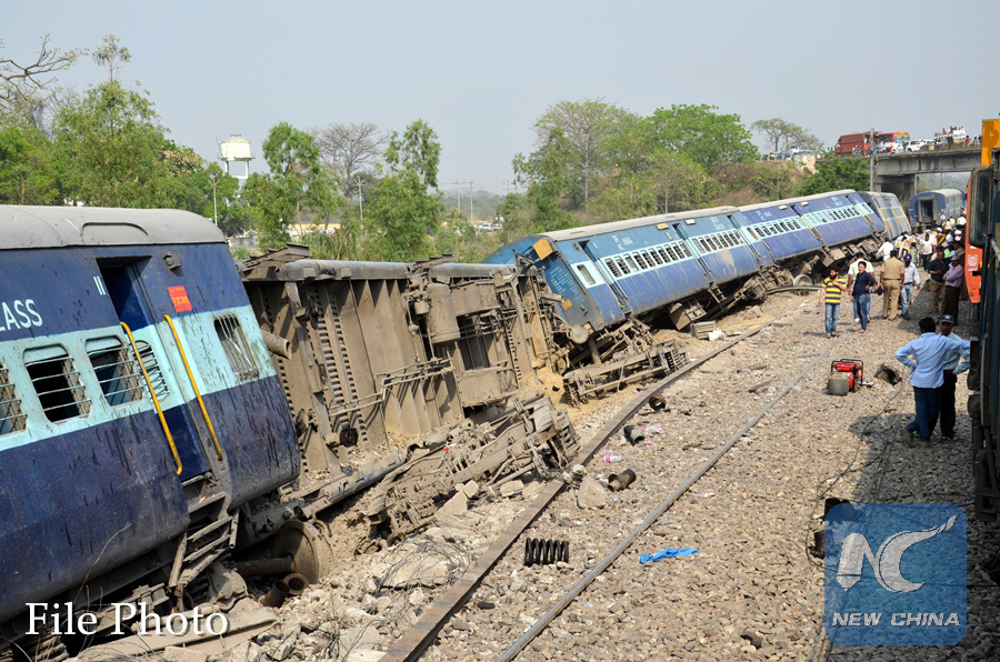 Photo taken on April 15, 2017 shows the site of a train derail accident in Rampur district, northern Indian state of Uttar Pradesh. (Xinhua/Stringer)