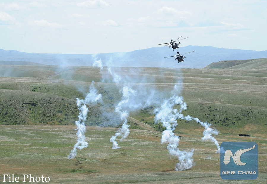 Helicopters are seen during a Georgia-Azerbaijan-Turkey joint military exercises at the military base of Vaziani near Tbilisi, Georgia, June 12, 2017. (Xinhua/Tamuna Kulumbegashvili)