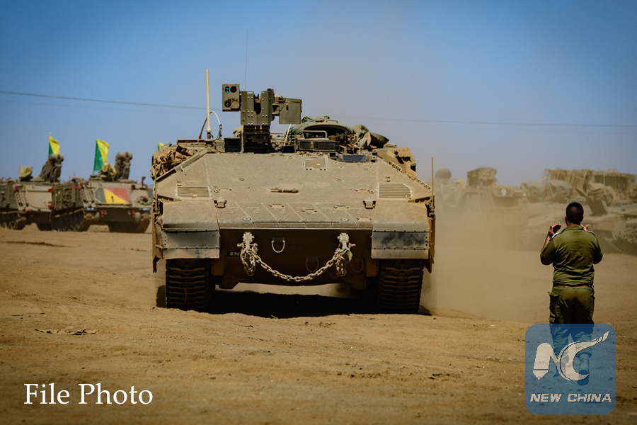 Israeli soldiers operate tanks and armored personnel carriers during a military exercise in the northern part of the Israeli-annexed Golan Heights on Sept. 13, 2017. (Xinhua/Ayal Margolin-JINI)