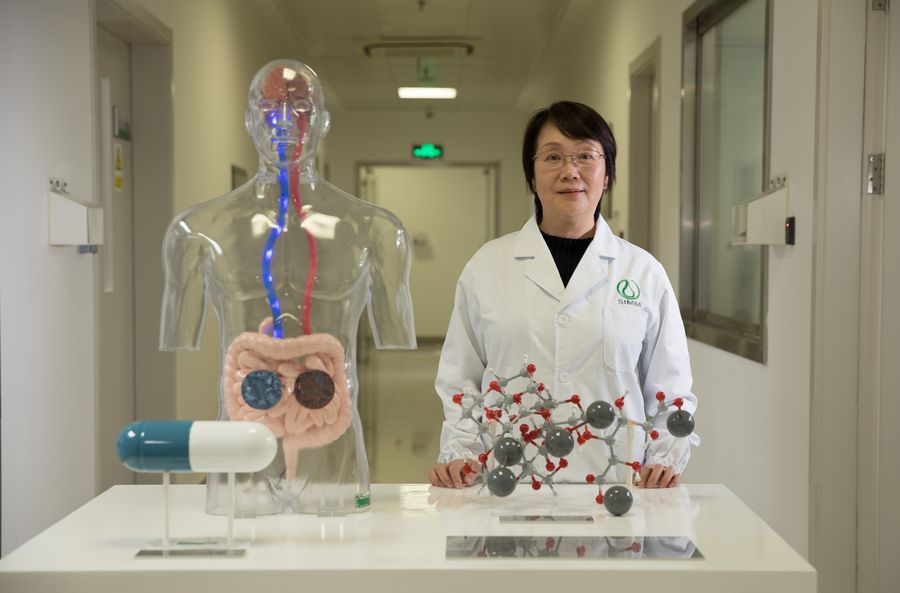 Geng Meiyu, key inventor of the drug GV-971, also a researcher of Shanghai Institute of Materia Medica under Chinese Academy of Sciences, poses for photos at the Green Valley institute in Shanghai, east China, Nov. 3, 2019. A home-grown drug for treating Alzheimer's disease has been approved by the National Medical Products Administration to hit the market, according to its developers Saturday. (Xinhua/Jin Liwang)