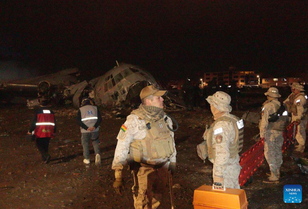 The security forces personnel work at a military plane crash site at El Alto International Airport in El Alto, Bolivia, Feb. 27, 2026. At least 15 people were killed and 30 others injured after a Bolivian military plane crashed on Friday in the western city of El Alto, local media reported.