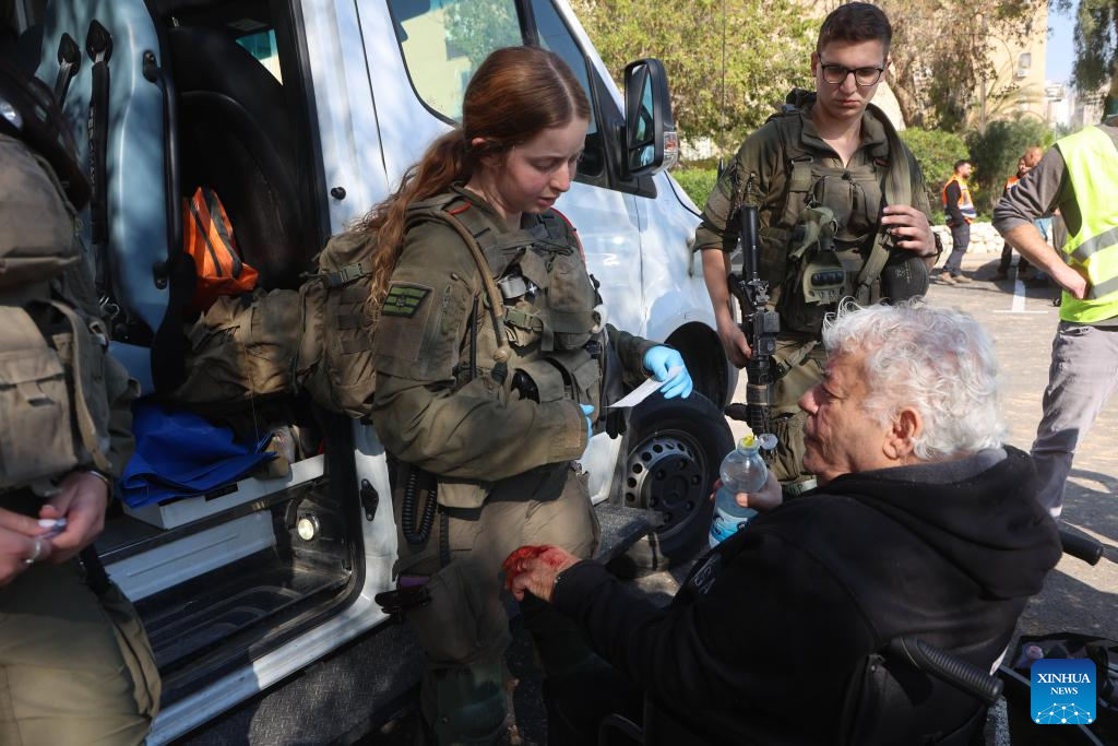 An injured person receives medical treatment at the site of a missile strike in Be'er Sheva, Israel, on March 2, 2026. A missile from Iran struck a residential area in the southern Israeli city of Be'er Sheva on Monday, injuring at least 15 people, according to Israeli authorities. (Photo by Gil Cohen Magen/Xinhua)