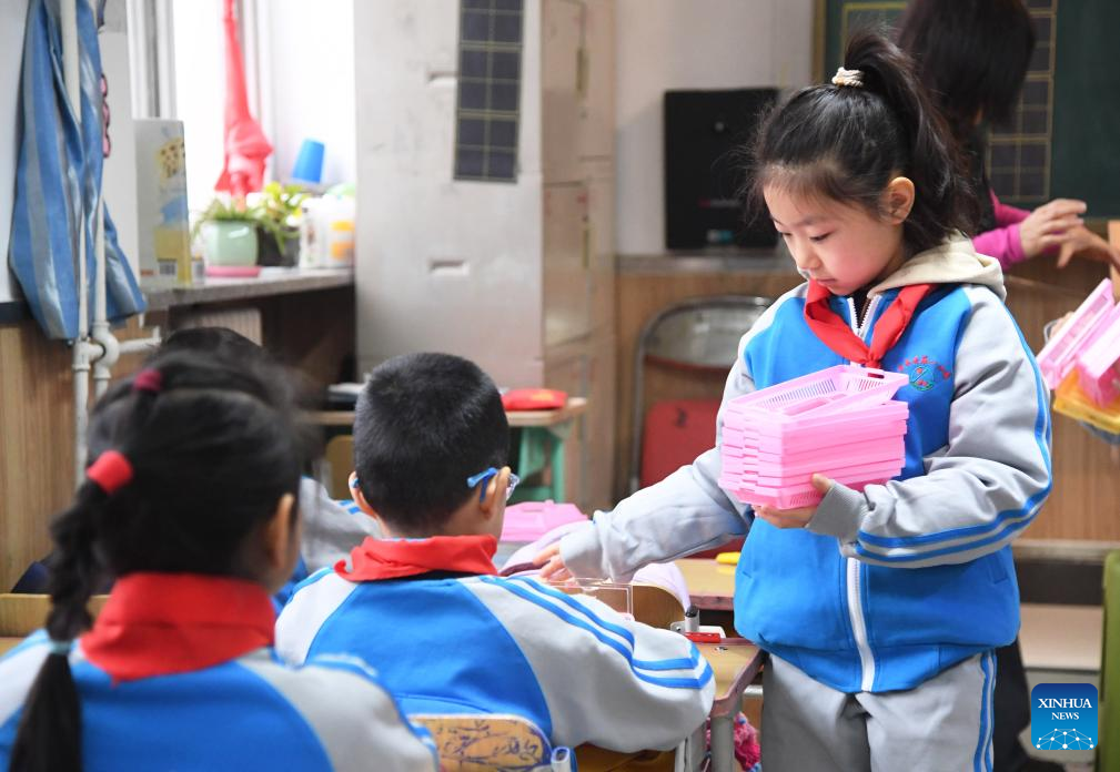 A student helps distribute teaching aids at a primary school in Pinggu District of Beijing, capital of China, March 2, 2026. A new semester kicked off for primary and secondary schools in many parts of China on Monday. (Xinhua/Ren Chao)