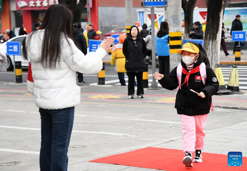 A teacher welcomes students in front of a primary school in Pinggu District of Beijing, capital of China, March 2, 2026. A new semester kicked off for primary and secondary schools in many parts of China on Monday. (Xinhua/Ren Chao)