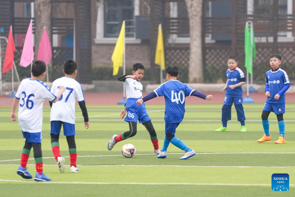 Students compete during a football match at a primary school in Beijing, capital of China, March 2, 2026. A new semester kicked off for primary and secondary schools as well as kindergartens in many parts of China on Monday. (Xinhua/Xie Han)