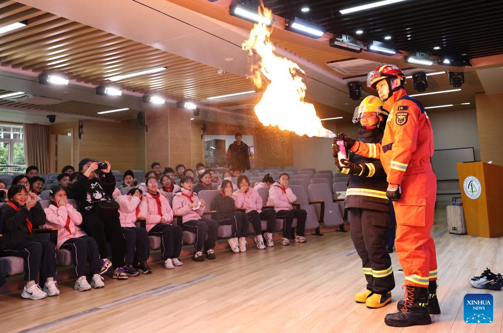 Firefighters help students understand the dangers of flammable materials during a lecture at a middle school in Changning District of east China's Shanghai, March 2, 2026. A new semester kicked off for primary and secondary schools as well as kindergartens in many parts of China on Monday. (Xinhua/Fang Zhe)