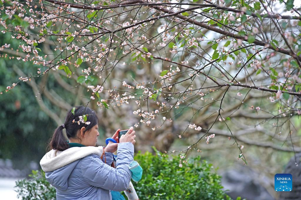 A citizen takes photos of plum blossoms in Qingxiu Mountain scenic area in Nanning, south China's Guangxi Zhuang Autonomous Region, Feb. 13, 2022. The Qingxiu Mountain scenic area has attracted many tourists as plum trees are in blossom in early spring. (Xinhua/Zhou Hua)