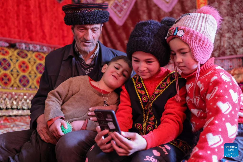 Children watch videos on a mobile phone with a family member in Rasekam Village of Taxkorgan Tajik Autonomous County, northwest China's Xinjiang Uygur Autonomous Region, Feb. 24, 2022.