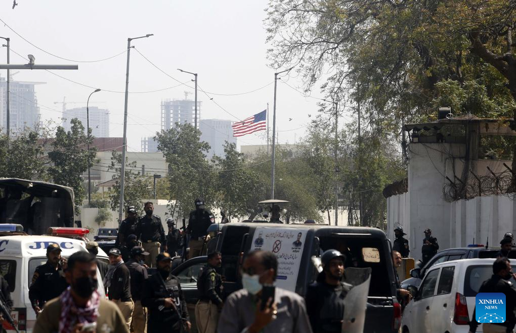 Law enforcement personnel stand guard during clashes with anti-U.S. protesters near the U.S. Consulate in southern Pakistani port city of Karachi on March 1, 2026. Twenty people were killed and over 100 others injured in anti-U.S. demonstrations in Pakistan on Sunday, police sources told Xinhua. (Photo by Imran Ali/Xinhua)