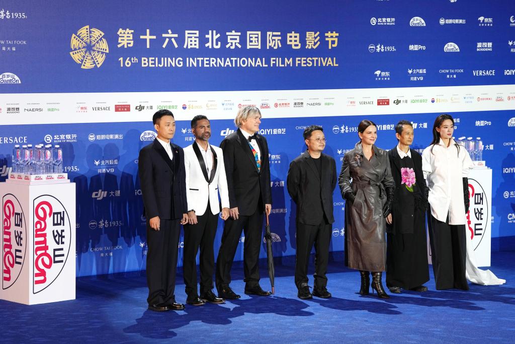 4月16日,第十六届北京国际电影节“天坛奖”国际评委会主席朱丽叶·比诺什(右三)和评委毕赣(中)、陈英雄(右二)、加布里埃尔·马斯卡罗(左二)、西蒙·弗兰格林(左三)、张小斐(右一)、张译 (左一)亮相开幕式红毯。新华社记者 鞠焕宗 摄