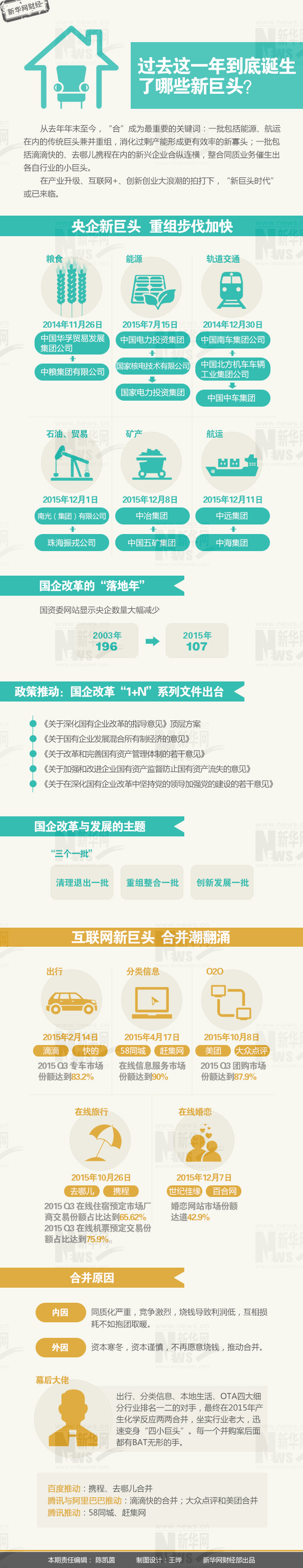 2015年,“央企艦隊”集結(jié)出發(fā),大重組、大整合時代開啟。年初,中國南車、中國北車——中國最大的兩家軌道交通裝備制造商在分開15年后再度合并。5月,國家核電和中國電力投資集團(tuán)宣布正式合并,新公司資產(chǎn)規(guī)模超過7000億元。