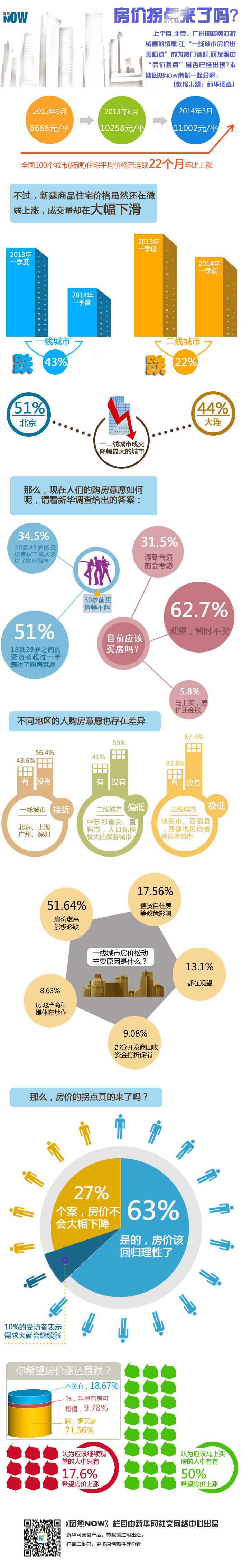 4月1日,中指院發(fā)布2014年3月中國(guó)房地產(chǎn)指數(shù)系統(tǒng)百城價(jià)格指數(shù)報(bào)告,在房?jī)r(jià)漲幅趨緩的同時(shí),成交量也大幅下滑,上個(gè)月,北京、廣州的樓盤打折銷售的消息,讓“一線城市房?jī)r(jià)出現(xiàn)松動(dòng)”成為熱門話題,“新華調(diào)查”欄目推出了“一線城市房?jī)r(jià)是否到了拐點(diǎn)?”的專題調(diào)查,那么,網(wǎng)友眼中“房?jī)r(jià)拐點(diǎn)”是否已經(jīng)出現(xiàn)?本期圖熱NOW帶你一起分解。