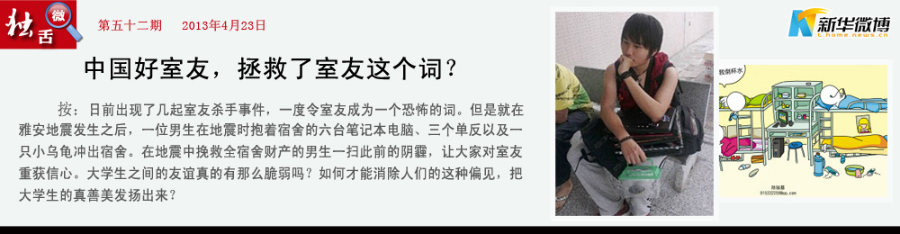 【室友中的戰(zhàn)斗機(jī)】 人固有一室友,或投毒殺人,或拯救其余室友電腦六臺(tái)單反三臺(tái)烏龜一籠于地震之中…… 他一個(gè)人拯救了全宿舍的財(cái)產(chǎn),對(duì)他的敬佩之情猶如滔滔江水連綿不絕!