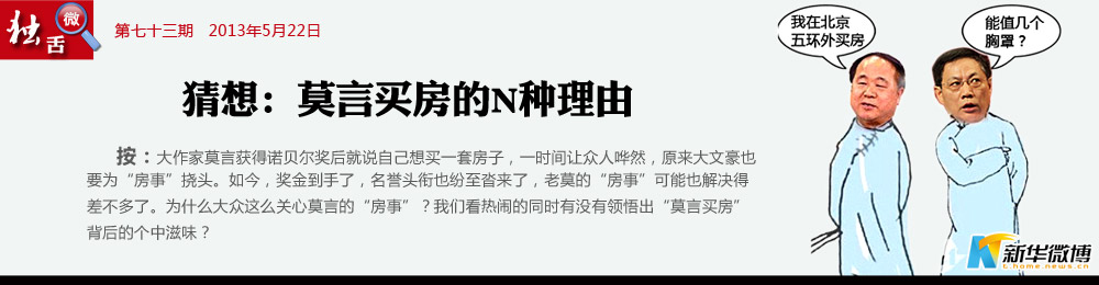 猜想二:安得廣廈五環(huán)外 安居才能樂業(yè),即便莫言用諾貝爾獎(jiǎng)金買房,也是可以理解的。一直以來,文人的命運(yùn),往往與時(shí)代命運(yùn)息息相關(guān)。居高不下的房價(jià),卻是百姓之痛。