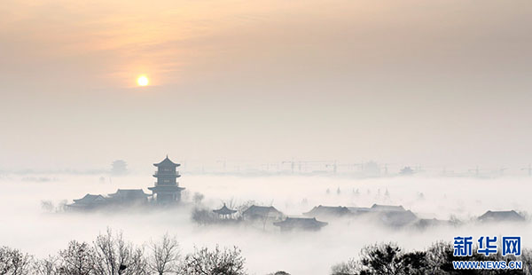终阙晨霞照雾开(摄影:李光,拍摄地:山东省聊城市东昌府区繁森路1号东昌湖畔孔繁森同志纪念馆)