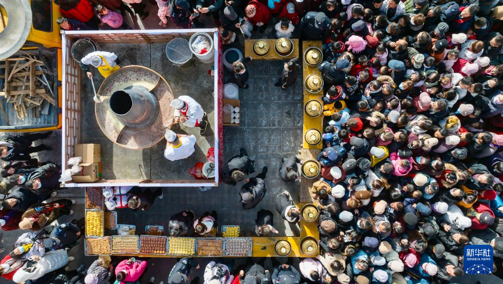 1月26日是中国传统的“腊八节”,在宁夏固原市隆德县民俗文化节现场,工作人员熬制腊八粥(无人机照片)。