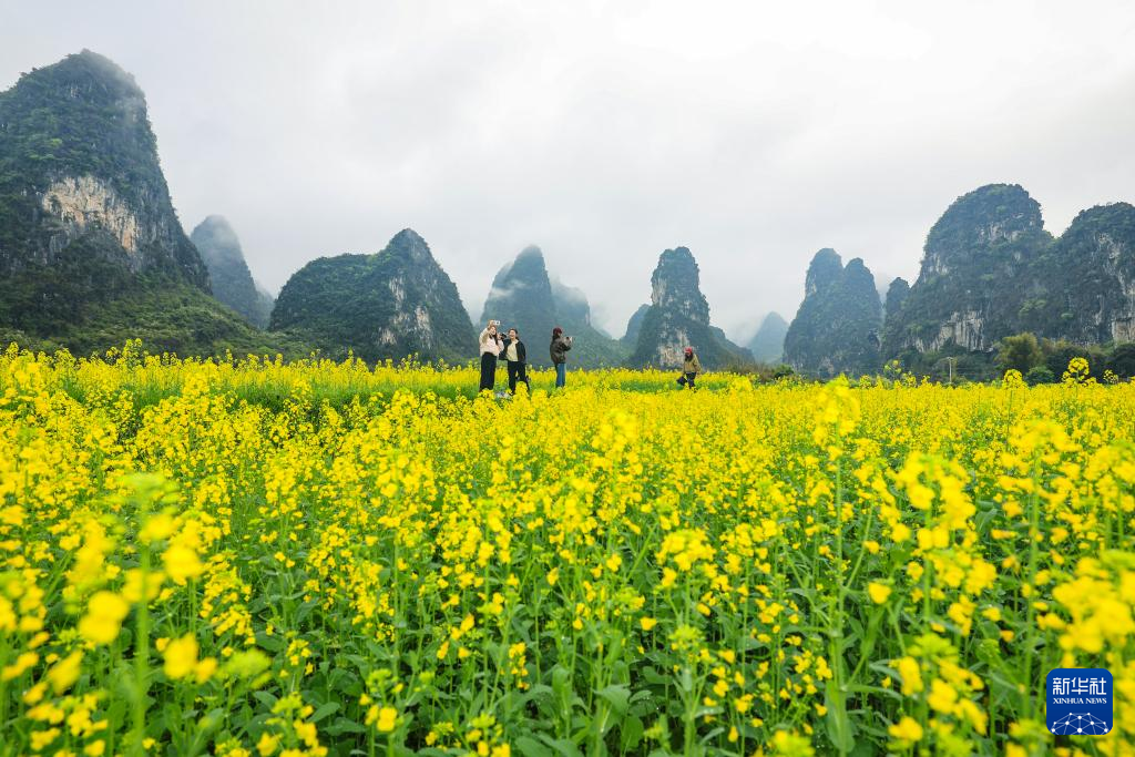 3月24日,人们在广西桂林市雁山区柘木镇油菜花田间游玩。