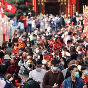 初一下午,大批市民在黃大仙祠前的廣場(chǎng)上排成長(zhǎng)龍,有序往前“流動(dòng)”。入口處豎立著一塊電子顯示屏,上有祠內(nèi)人數(shù)實(shí)況,提醒門口防疫人員何時(shí)放行。