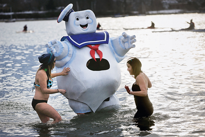 温哥华举办的元旦北极熊冬泳活动,每年都吸引众多市民参与。图为温哥华市民挑战冰冷的海水
