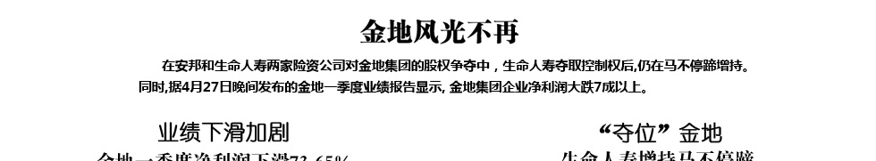 險資“咄咄逼人” 股權之爭何時了? 根據金融街一季報顯示,除了第一大股東北京金融街集團為國有法人外,十大股東中的其他均是機構投資者:4家保險、3家信托和2家基金重倉。 4月底和諧健康險舉牌后,安邦系已經成為第二大股東。加上舉牌后的和諧健康險,其余九大股東總共持倉為13.45%。其中,安邦保險子公司和諧健康險一季度持股金融街5162.6萬股,占比1.71%,位列第三大股東。 5月6日,金融街控股股東金融街集團及其一致行動人增持了公司股份55,000,000股,占公司股份總數的1.82%。增持后,大股東合計持有金融街股份總數的29.74%,逼近30%的收購邀約線。 |