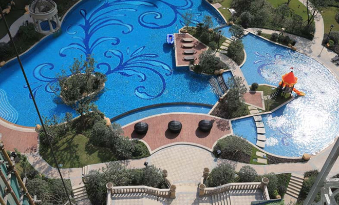 據(jù)資料顯示,大名城綠化率為41.5%,樓間距為160米,小區(qū)內(nèi)部區(qū)規(guī)劃擁有中央疊瀑和中央泳池。目前,大名城東區(qū)1400㎡無邊界游泳池已經(jīng)開放使用。記者實地走訪泳池周邊發(fā)現(xiàn),一名工作人員正在清理池內(nèi)雜物,該工作人員告訴記者,大名城工作人員會定時清理泳池及周邊景觀區(qū)域,保證小區(qū)內(nèi)部時刻干凈整潔。縱觀東區(qū)整體景觀,池水清澈,周邊花卉植物、雕像噴泉錯落有致,景觀整體格調(diào)高端。