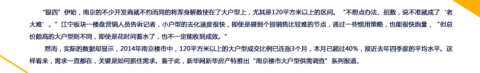 據(jù)黃媛分析,大戶型的熱銷(xiāo)主要原因有二。一是片區(qū)規(guī)劃的利好,周邊配套逐步成熟,吸引了主城區(qū)的客戶。而是其他片區(qū)單價(jià)昂貴,直接導(dǎo)致大戶型總價(jià)“離譜”,若想在南京改善居住品質(zhì),那么只有選擇還處于價(jià)格洼地的江北。黃媛認(rèn)為300萬(wàn)是個(gè)臨界點(diǎn),如果大戶型總價(jià)在300萬(wàn)以內(nèi),購(gòu)房者是可以接受的,但如果超過(guò)300萬(wàn),開(kāi)發(fā)商就會(huì)比較頭疼房子怎樣才能賣(mài)出去。