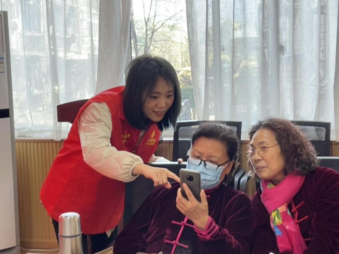 图:“红马甲”志愿者在教会老人使用手机