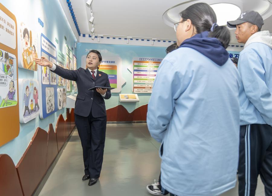 在城关区青少年法治实践教育基地,“格桑梅朵护未队”成员次央在给拉萨市第二中等职业技术学校学生进行讲解。新华社记者 旦增尼玛曲珠 摄