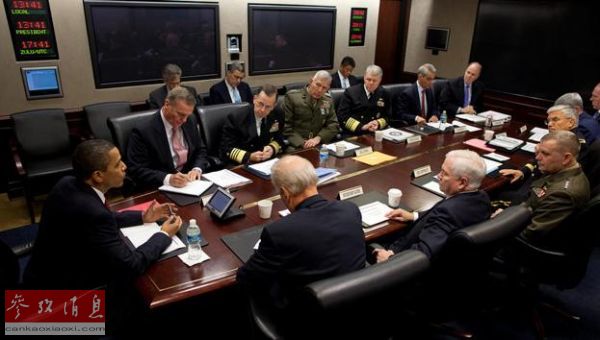 ??? 資料圖:2009年10月,美國總統(tǒng)奧巴馬在白宮時局值班室與美軍參謀長聯(lián)席會議成員及高級軍事顧問商討阿富汗作戰(zhàn)事宜。