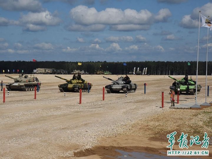 “坦克兩項”半決賽接力賽中國、吉爾吉斯斯坦、亞美尼亞、安哥拉的4輛坦克準備出發(fā)。武元晉 攝
