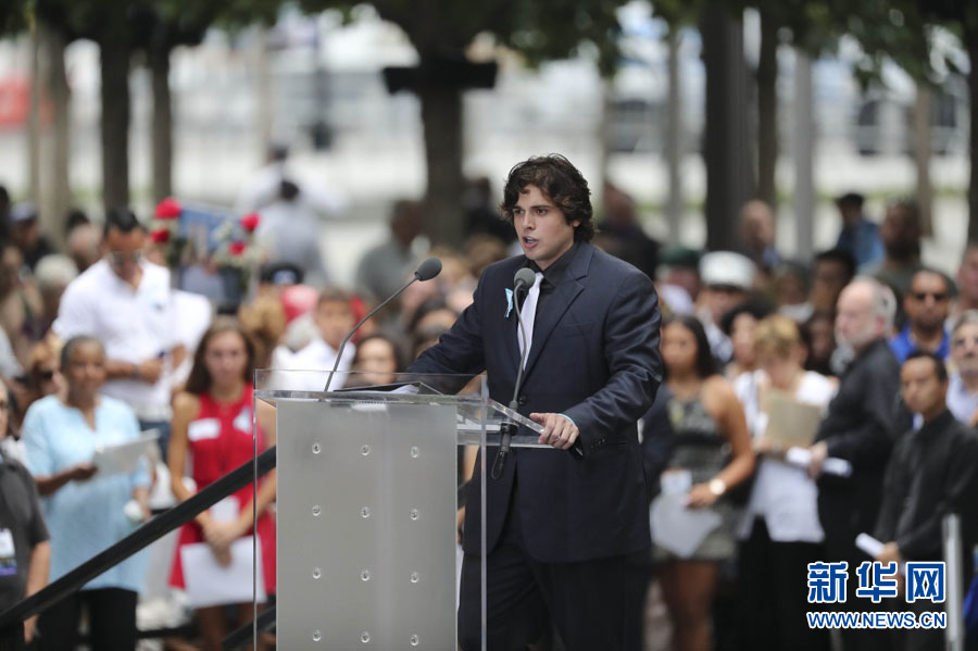 ????9月11日,在美國紐約,一名“9·11”恐怖襲擊事件遇難者的兒子在紀念活動上宣讀遇難者姓名。