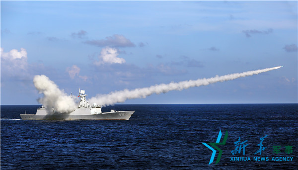 ??? 海軍在海南島至西沙附近??沼蚪M織實(shí)兵實(shí)彈對抗演練,這是導(dǎo)彈護(hù)衛(wèi)艦運(yùn)城艦發(fā)射反艦導(dǎo)彈(7月8日攝)。新華社記者查春明攝