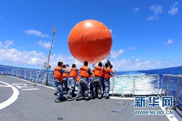 順利完成射擊任務(wù)的長沙艦,與??谂炦M(jìn)行“敵我角色互換”,在演練區(qū)域內(nèi),布放下靶標(biāo)。