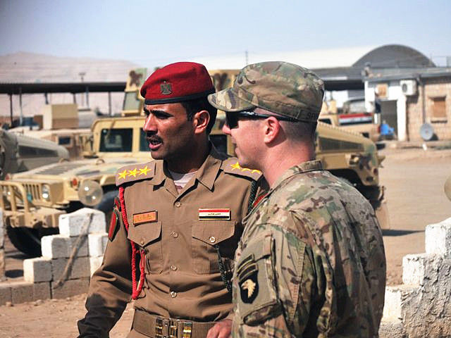 2016年9月6日,伊拉克斯威夫特營地,美軍打擊部隊(duì)軍官與伊拉克軍官交談。(新華/美聯(lián))