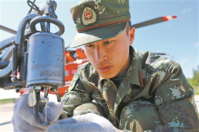 日曬、風(fēng)吹、雨淋,直升機的“衣服”——蒙布發(fā)生破損怎么辦?這可難不住心靈手巧的官兵。你看,武警森林指揮部直升機支隊的代理機械師王丹宇就自己動手,從老鄉(xiāng)那里借來手搖修鞋機,頂著盛夏的烈日一針一線仔細修補,看起來還挺有小裁縫的范兒呢。韓興華 攝