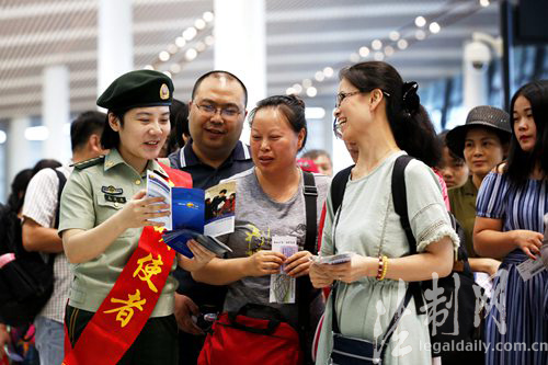 圖為邊檢官兵向出入境旅客普及邊檢知識(shí)