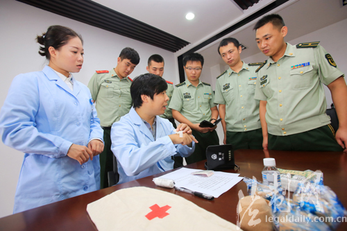 圖為醫(yī)護(hù)人員在邊防派出所為官兵講解警用裝備包中急救物品的使用方法及注意事項(xiàng)