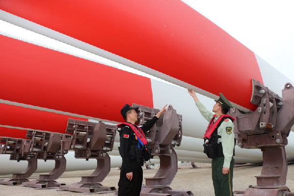 福建莆田邊檢站官兵正在對巨型風(fēng)電葉片進(jìn)行安全檢查